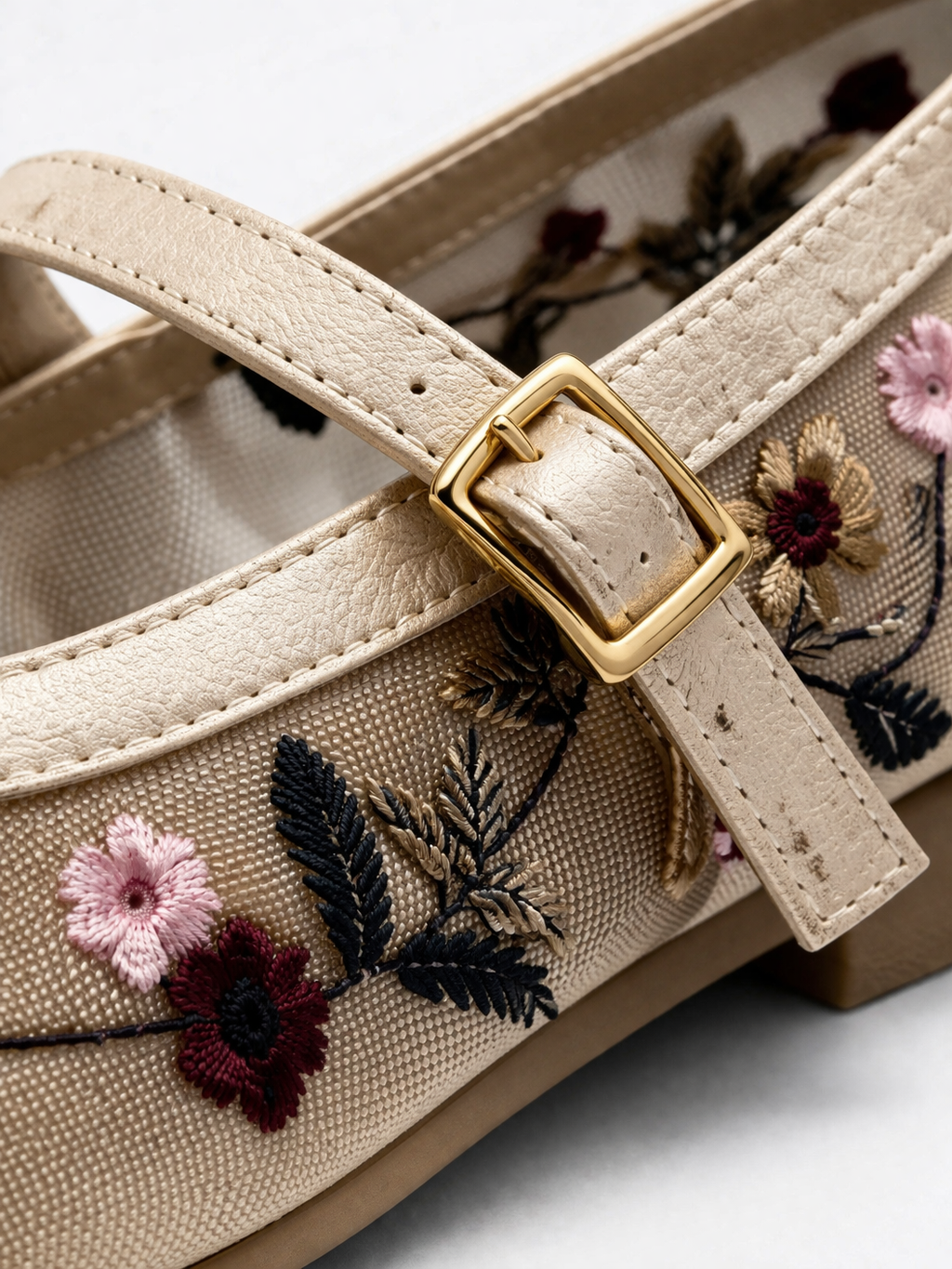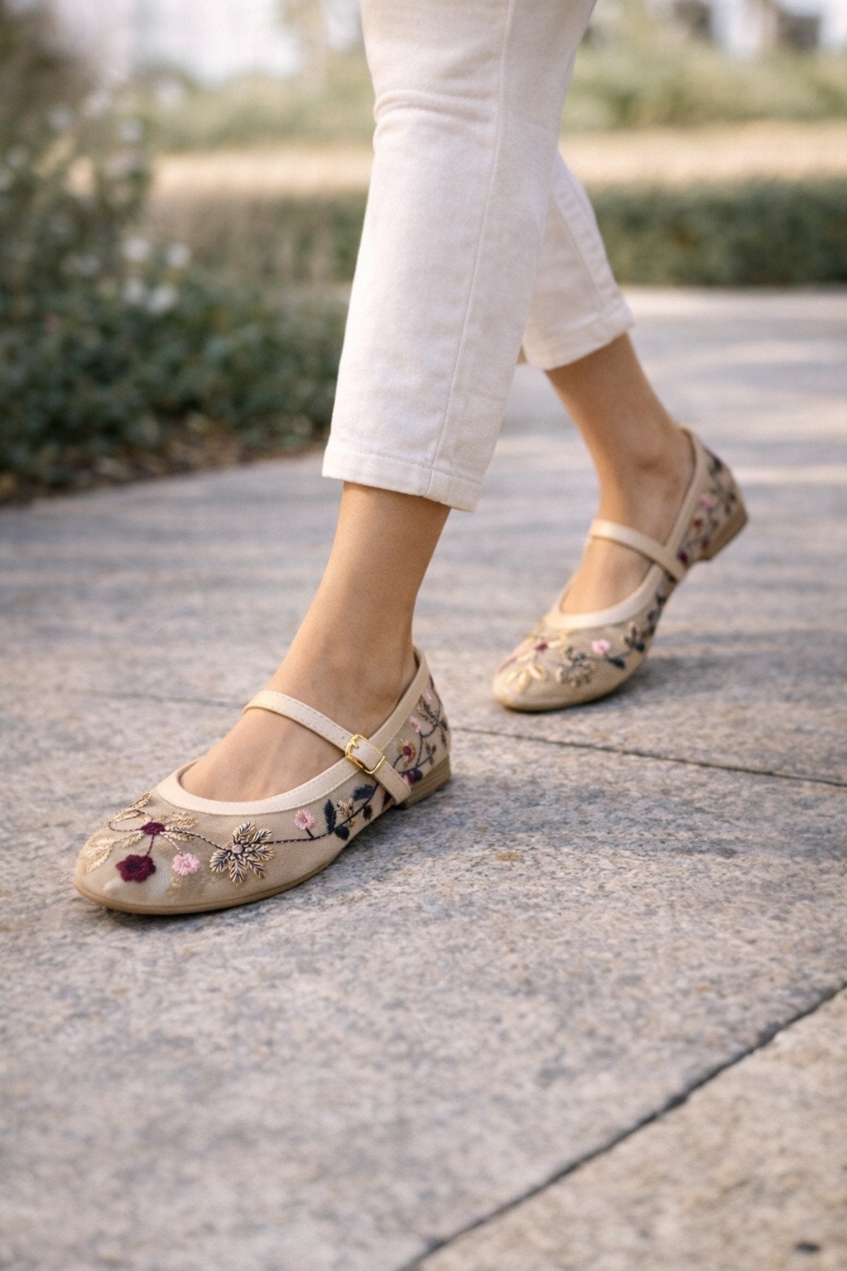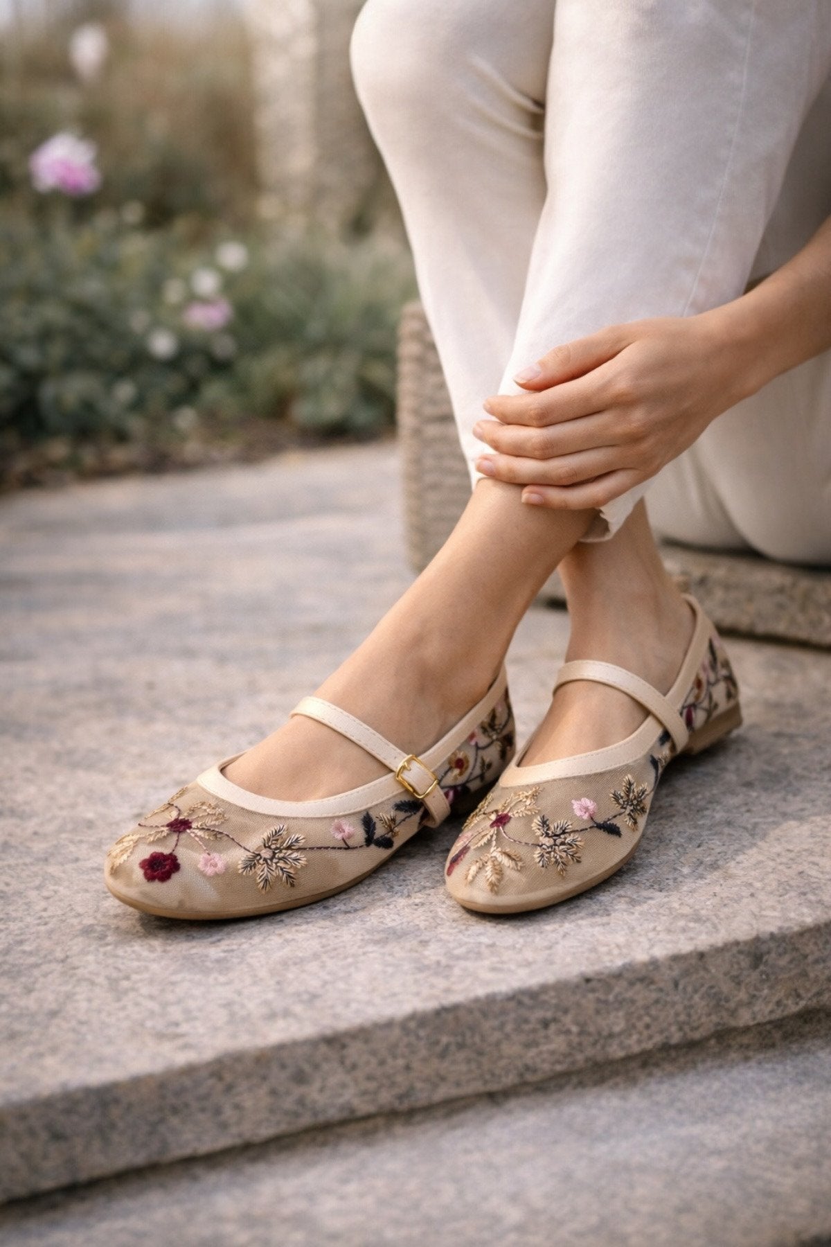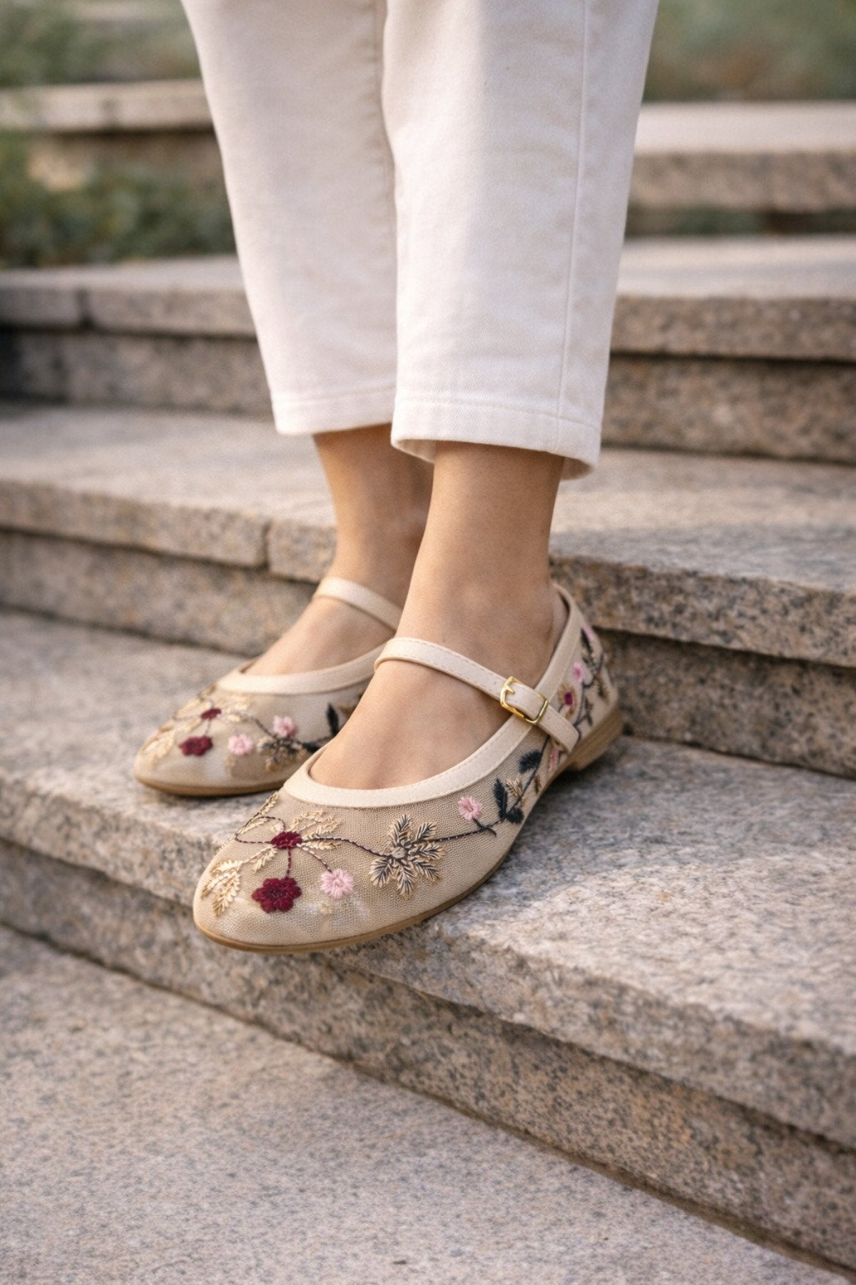 Kadın Bej Çiçek Nakışlı Mary Jane Babet Günlük Rahat Babet Ayakkabı