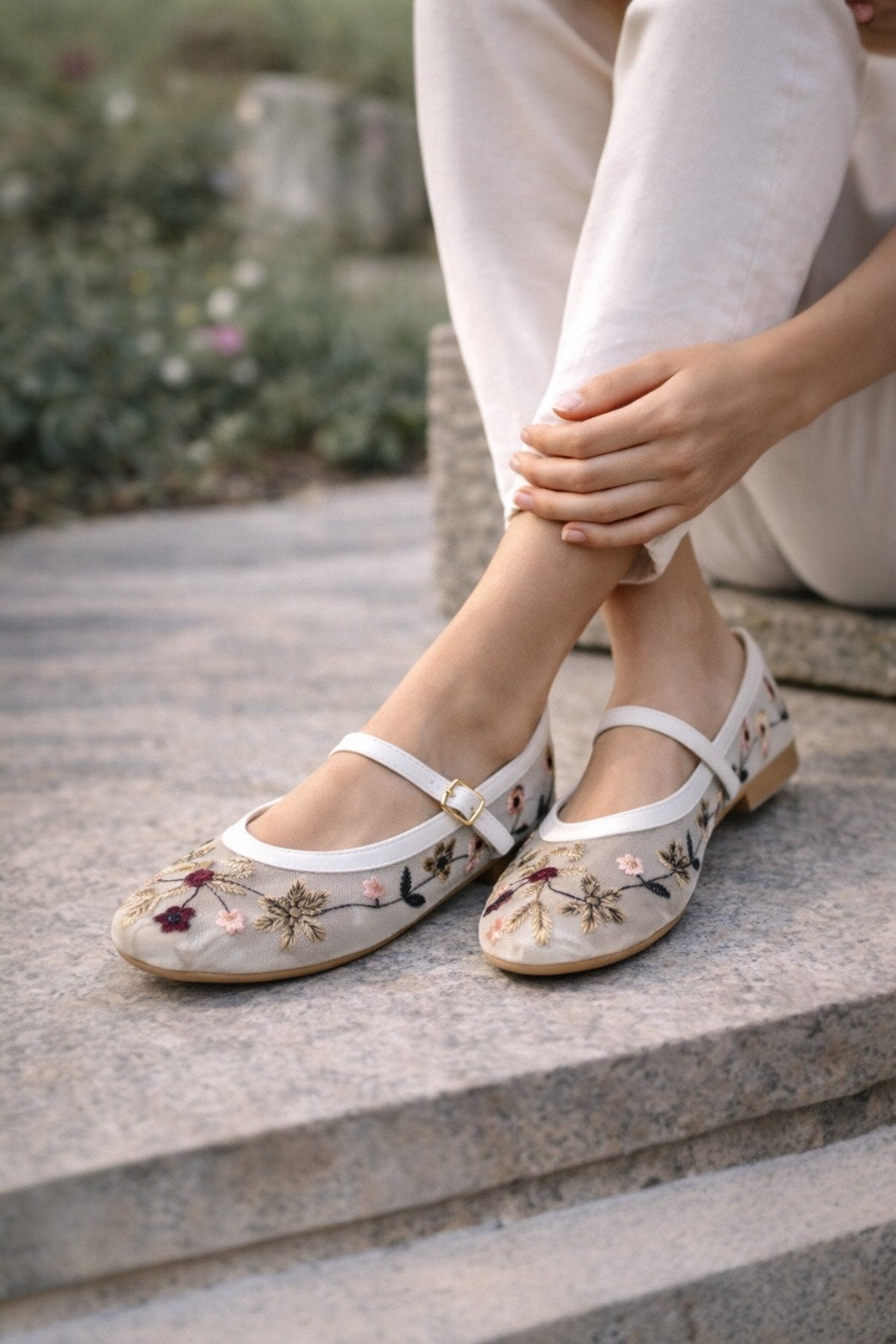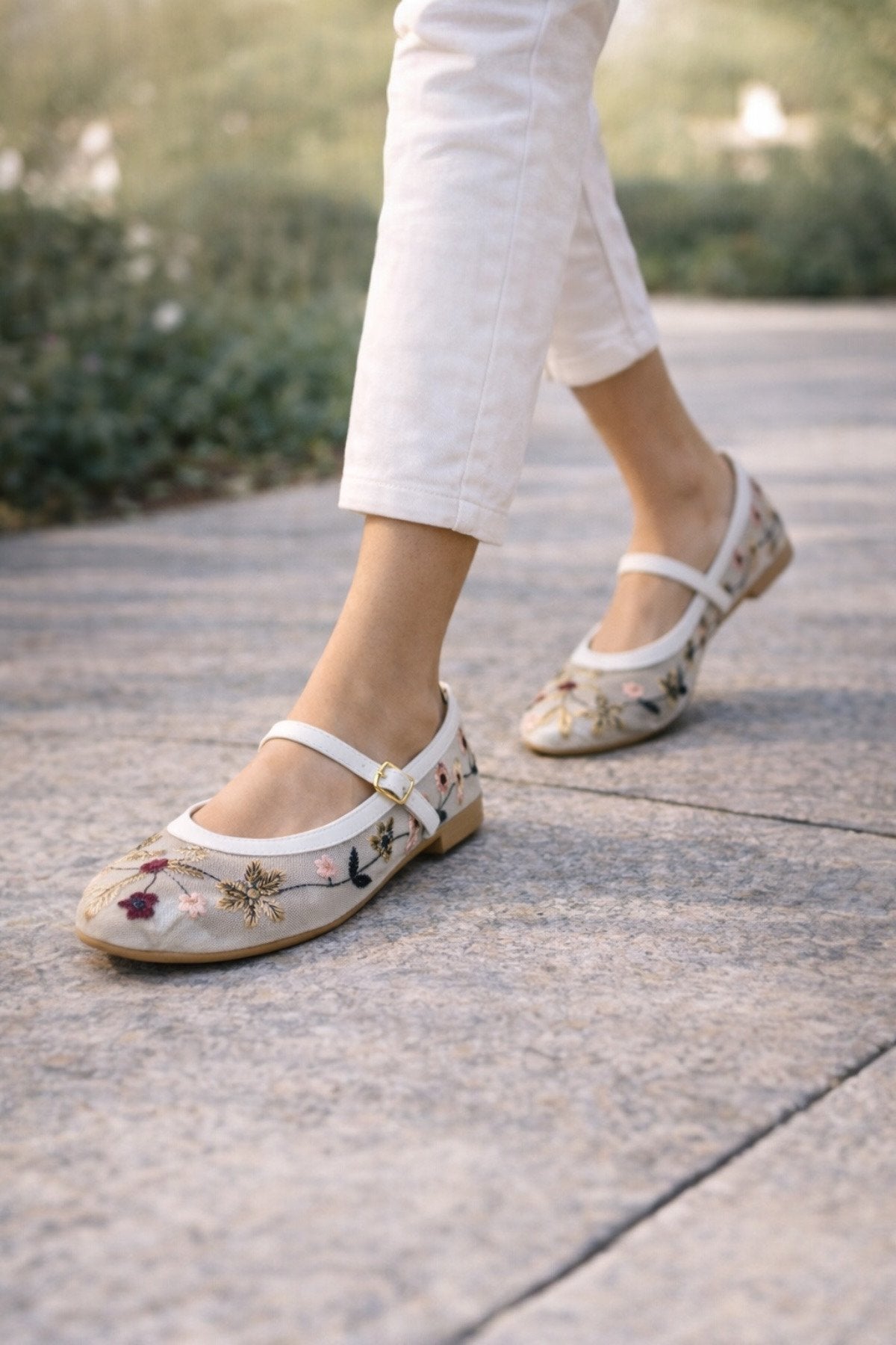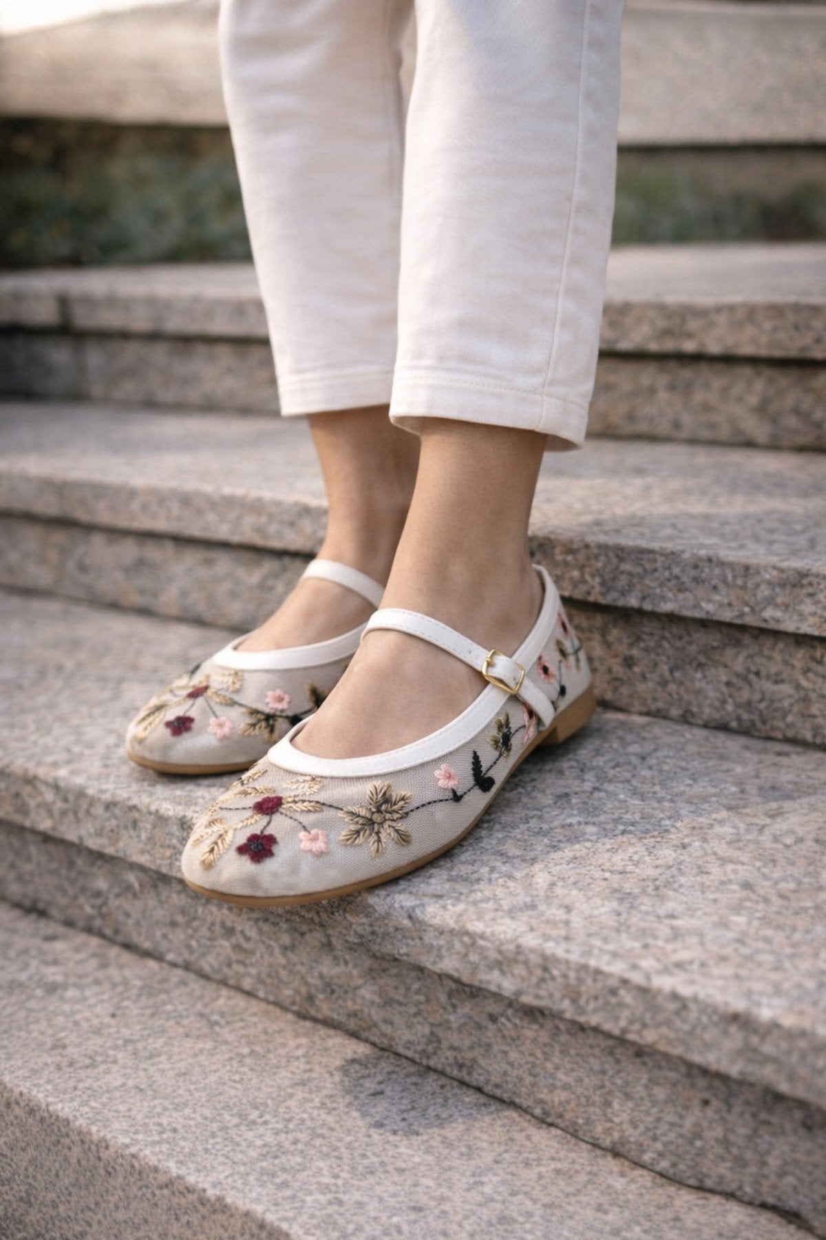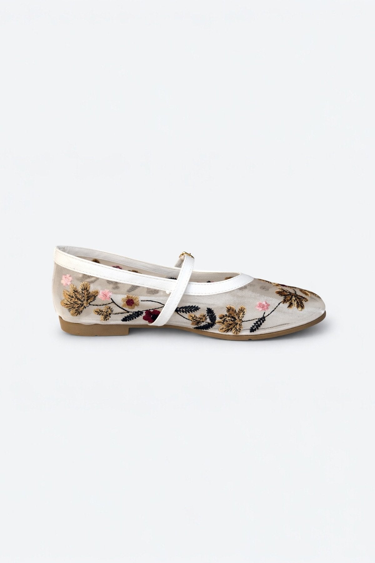Kadın Beyaz Çiçek Nakışlı Mary Jane Babet Günlük Rahat Babet Ayakkabı