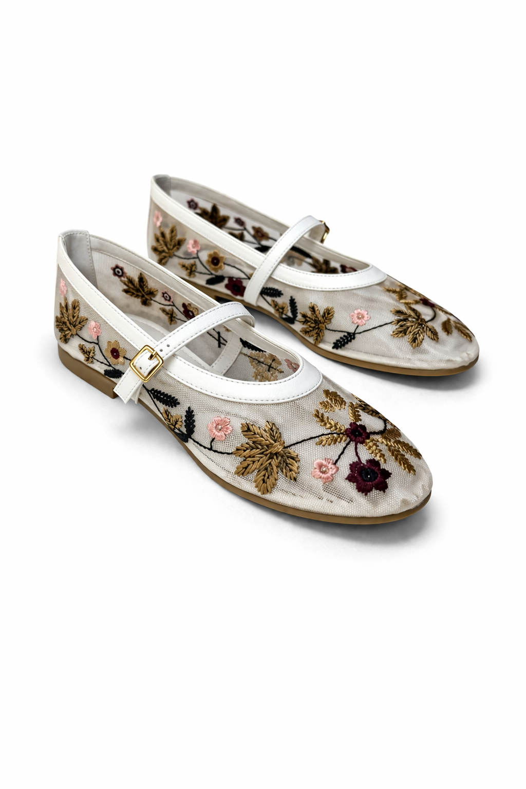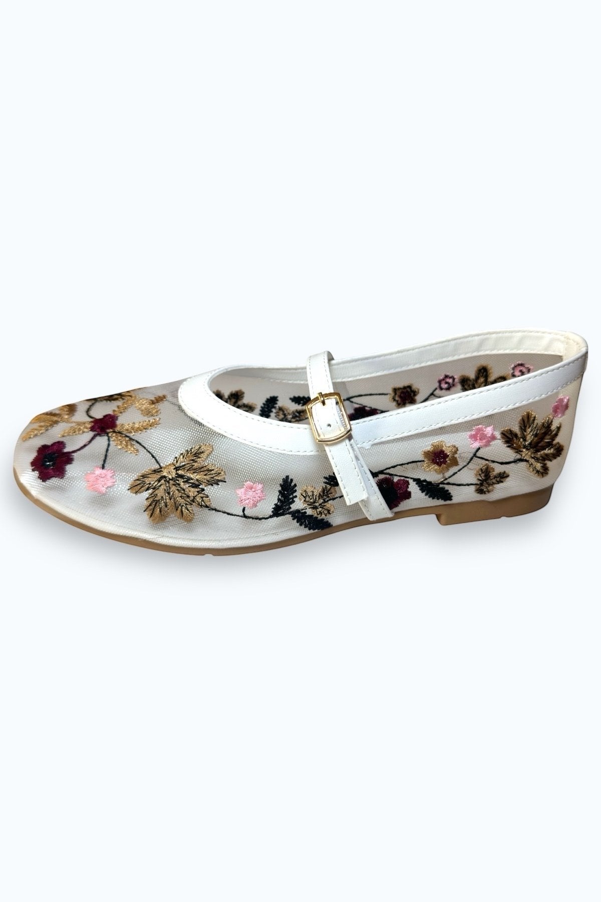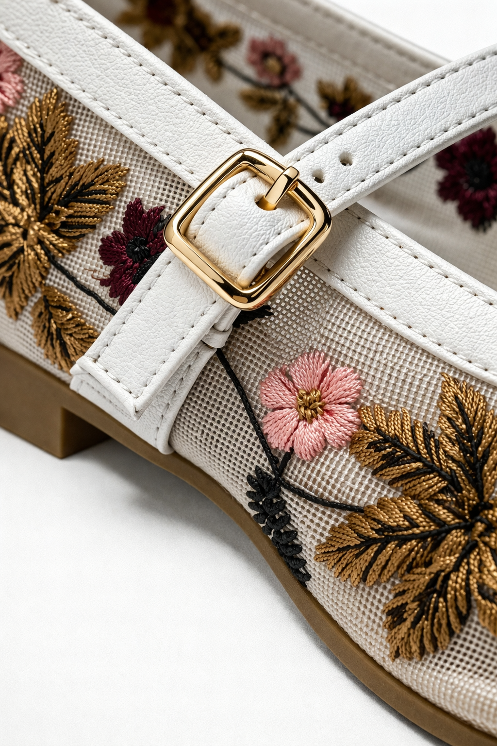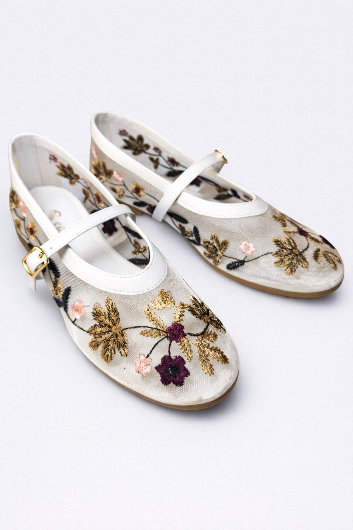 Kadın Beyaz Çiçek Nakışlı Mary Jane Babet Günlük Rahat Babet Ayakkabı