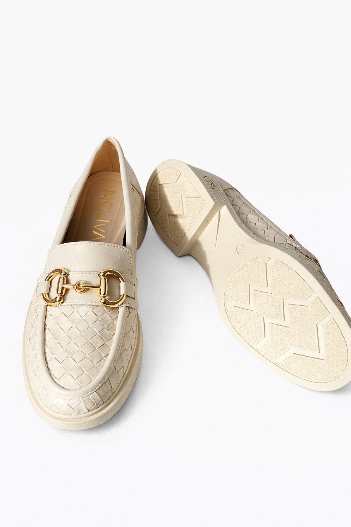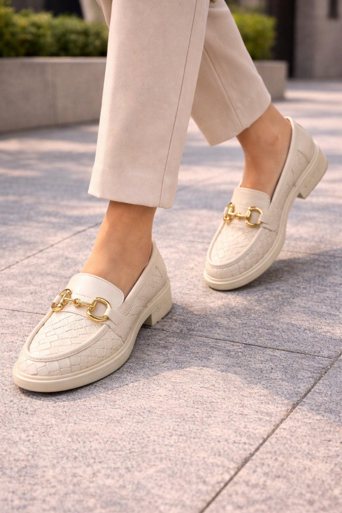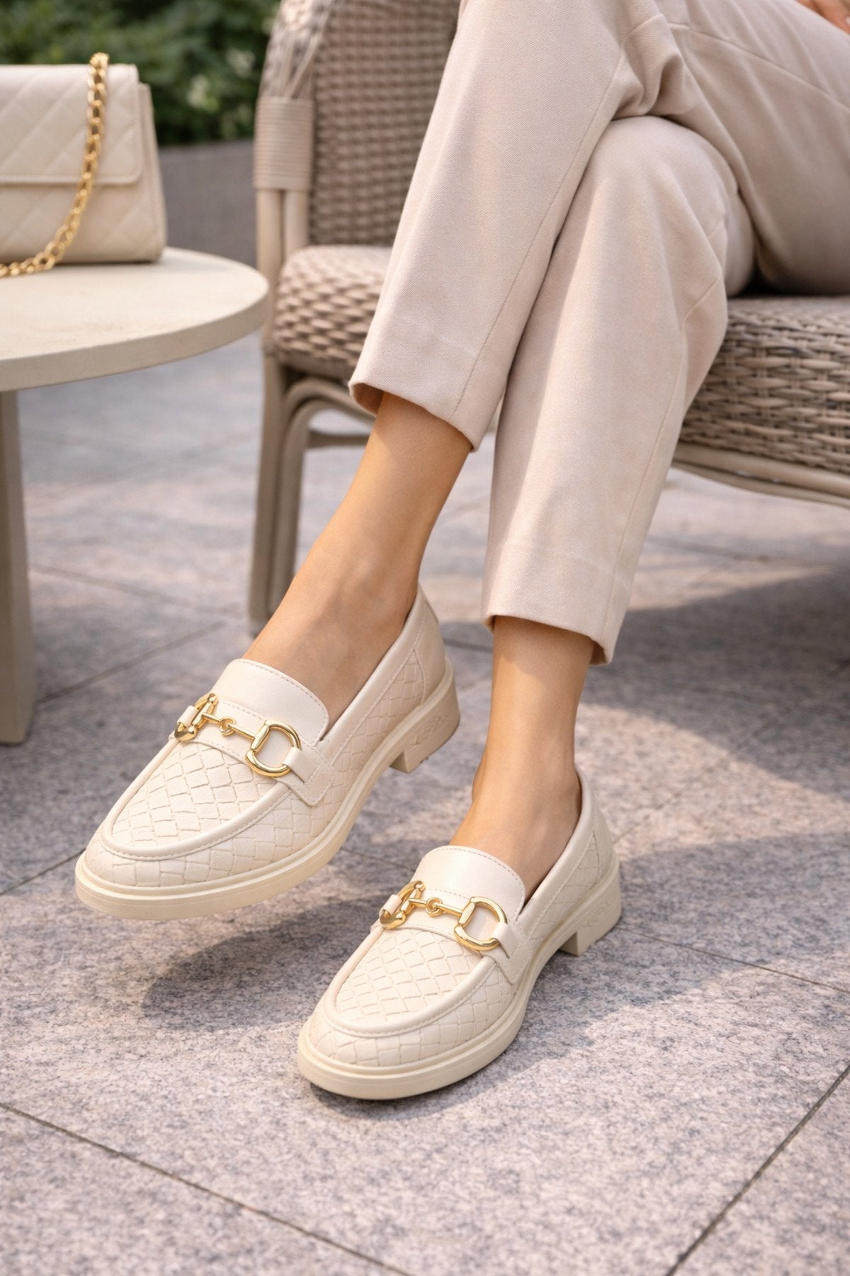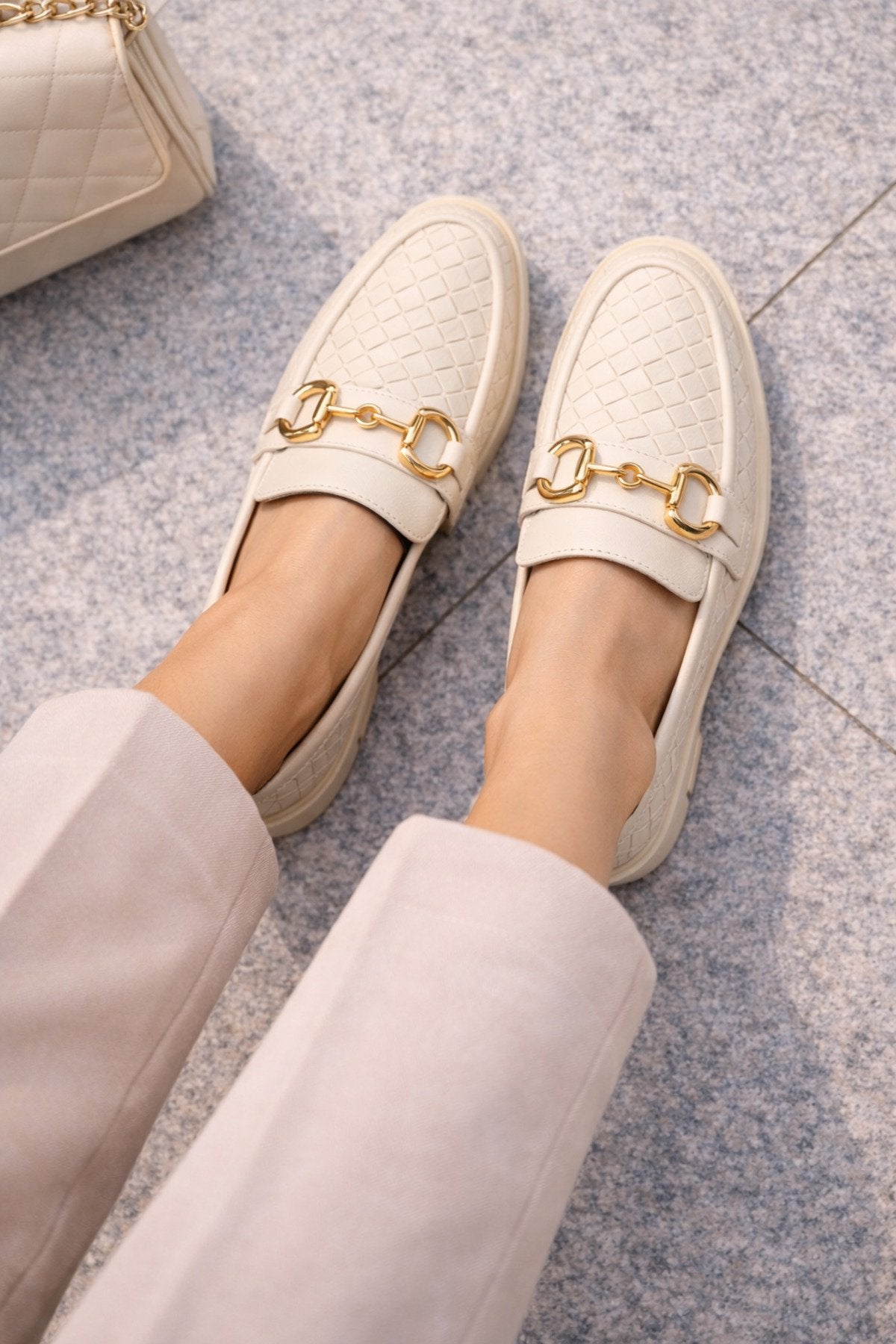 Kadın Örgü Desenli Gold Zincir Tokalı Kalın Tabanlı Loafer Ayakkabı