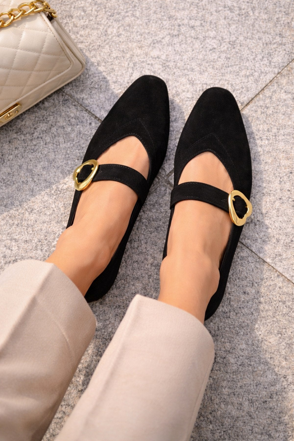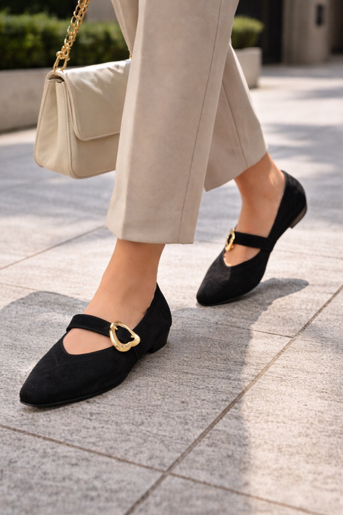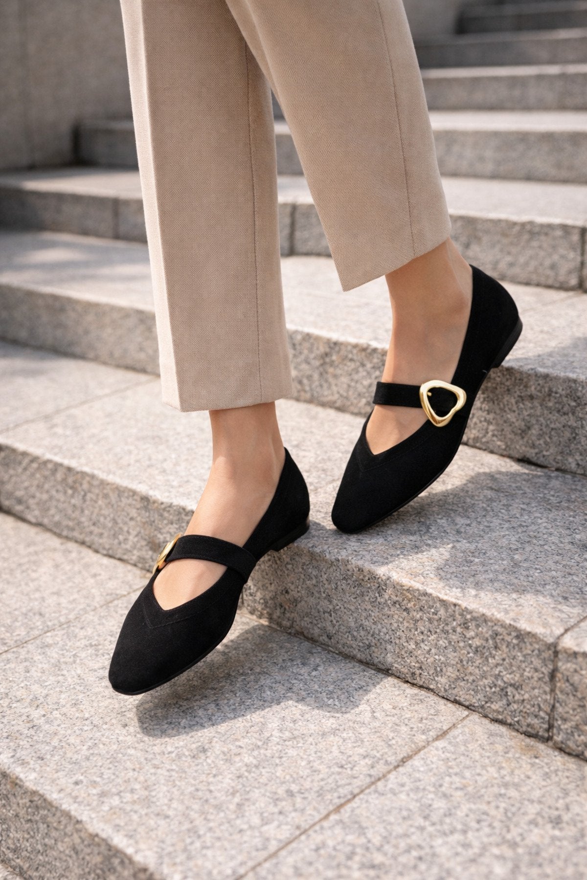 Kadın Siyah Süet Kalp Tokalı Babet Günlük Şık Mary Jane Babet